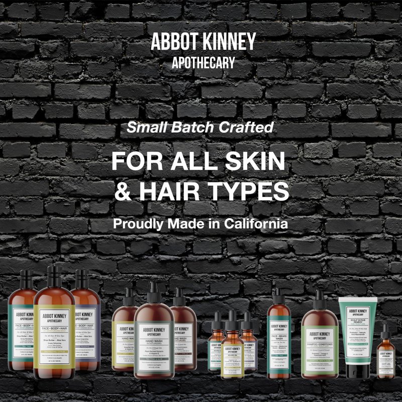 - CRAFTED IN SMALL BATCHES IN LOS ANGELES - as with all Abbot Kinney Apothecary mens products, our men's body wash 3 in 1 is paraben and cruelty free. Enjoy a premium grooming experience while supporting small business.