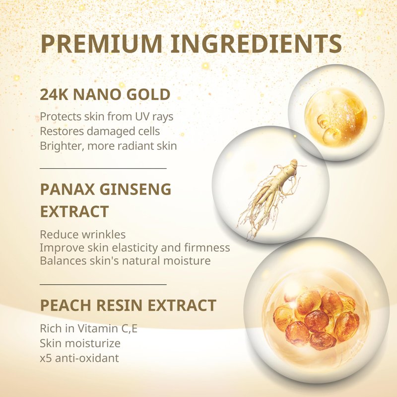 ๐๐ซ๐๐ฆ๐ข๐ฎ๐ฆ ๐๐ง๐ ๐ซ๐๐๐ข๐๐ง๐ญ๐ฌ: Our formula is crafted with the highest quality 24K Gold and Panax Ginseng Extract, ensuring superior skincare results.