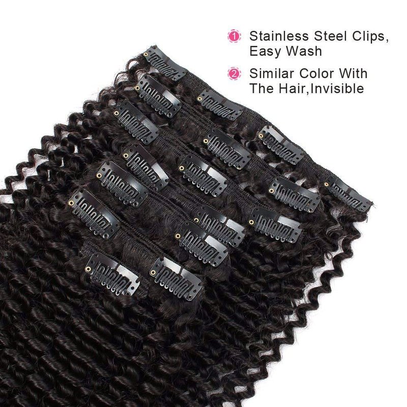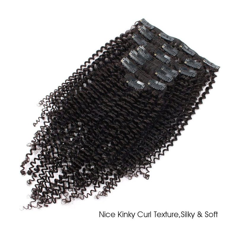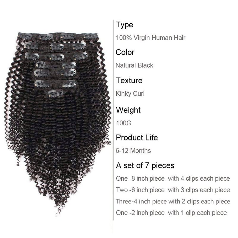 AmazingBeauty Kinky Curly Clip in extensions is double weft and already attached clips for using. The beautiful 3C/4A type is kinky screw curls with lots of volume. The curls is between Jerry curly and Afro curly which is super soft, fluffy, dense, springy and delightful. You can wash it, color it and iron it, and you can also make it Bantu knotted or twisted out and more to achieve your dream look.