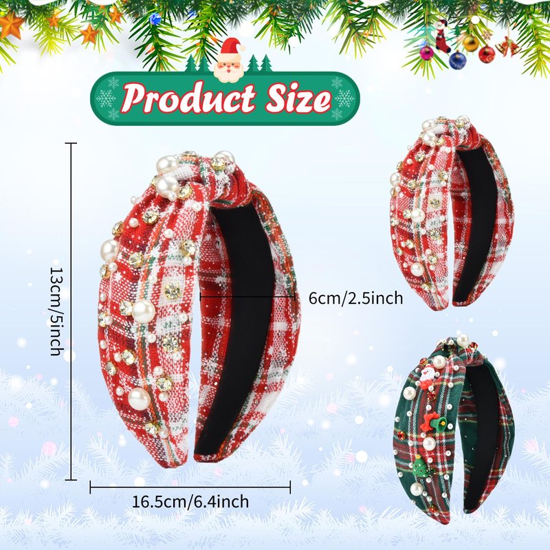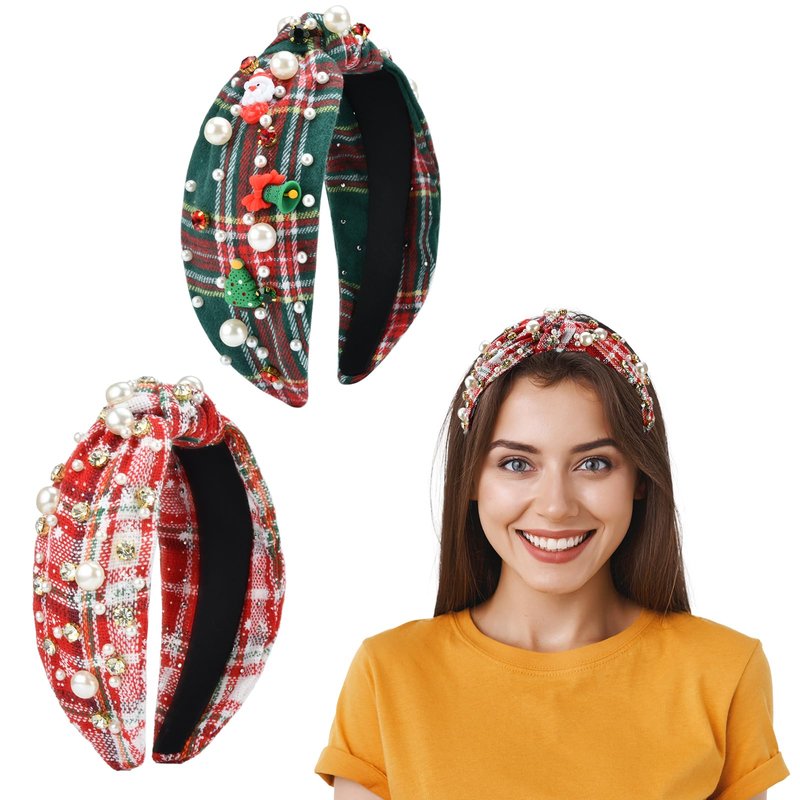 - Christmas Headbands for Women: This fashion and cute Christmas headband features a classic Christmas plaid base with sparkly rhinestone, faux pearl, snow, Christmas Bell and Santa Claus.Nice classic fancy top knot headbands for Christmas Holiday.