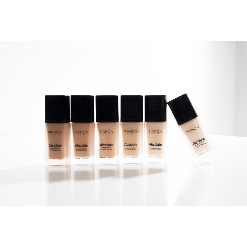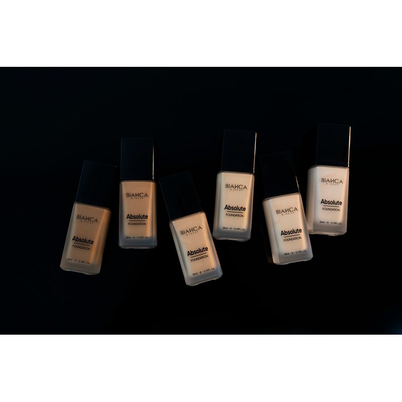 Discover Bianca Makeup's Absolute Foundation liquid foundation. This foundation has it all: high coverage, matte finish, extreme 24-hour waterproof and sweat-proof wear, and a lightweight texture with a natural finish. Absolute Foundation is a non-cracking foundation that provides a luxurious finish on the skin. Its blend of silicones gives a smooth, dry, lightweight, and silky texture. Additionally, it contains natural ingredients like shea butter and vitamin E, which nourish and protect the skin while applying makeup. With its creamy liquid formula, it controls skin oiliness and provides a natural matte finish with full coverage, leaving it mattified all day long. Waterproof and humidity-resistant, this foundation will stay flawless even in adverse conditions. Absolute Foundation is available in 6 different shades: Sand, Bronze, Nude, Gold, Vanilla and Toast, so you can find the perfect tone that matches your skin and style. With Absolute Foundation, you'll get impeccable and long-lasting coverage that enhances your natural beauty and makes you feel confident and radiant on any occasion.