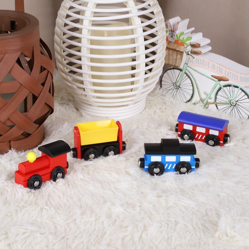 - WOODEN TRAIN SET: Train set includes 4 wooden train cars. The wooden train set includes an engine, a cargo car, and two passenger cars.