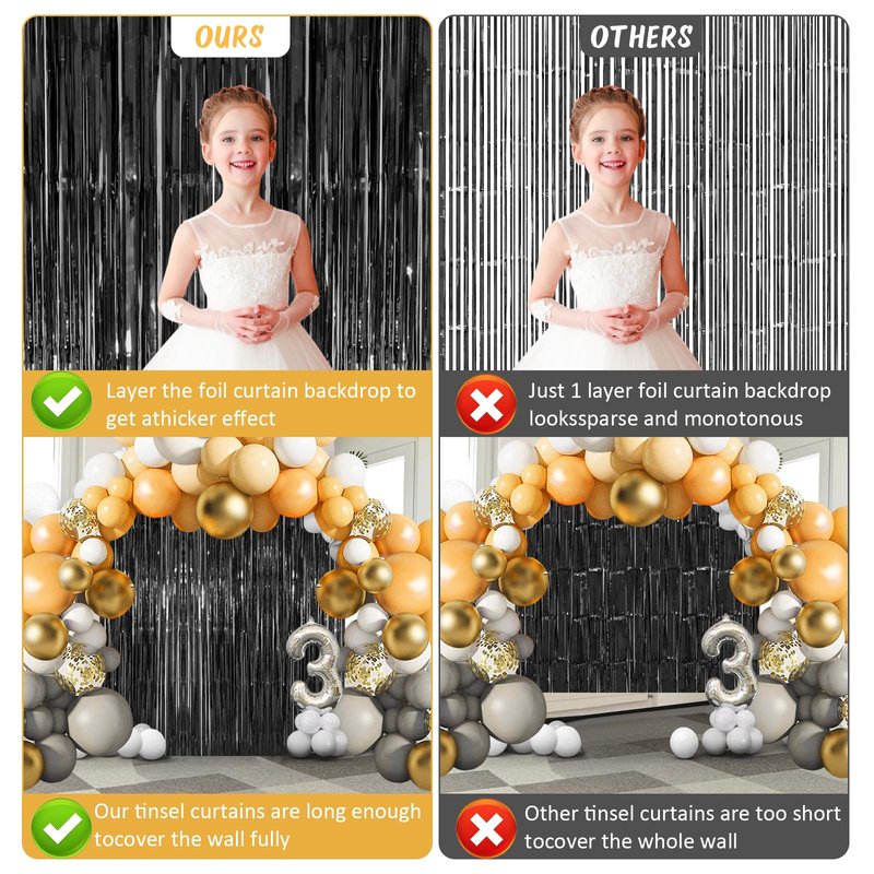 - Safe Material: This Black Tinsel Foil Fringes Curtain Streamers is Made of High-Quality Shiny Foil, Non-toxic, Odorless, and Non-fading, Safe for Families with Children and Pets, The Adhesive Will Stick Well Enough to Hold the Fringe Curtains Up, If You Don't Need Them Anymore, You Could Peel Them Off and They Won't Leave Any Residue, Lightweight, Durable and Reused Sparkle Metallic Fringe Streamers, Decorate for a Shiny Party, Enjoy a Party with Family, Friends and Loved Ones