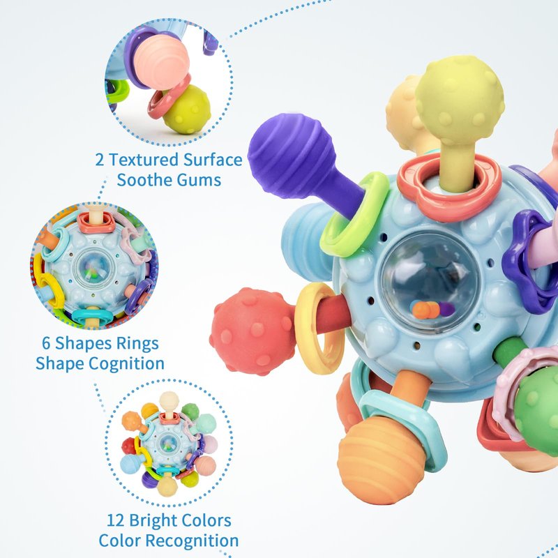- Sensory Developmental Toys: Different 12 Bright Color Teether Balls and Rattling Sounds, Attaract Baby's Attention, Encouraging Their Hand-eye Coordination and Visual Tracking Skills, Engaging Babies in Sensory Exploration, Promote Visual and Auditory Development, The Different Textures and Patterns Provide a Stimulating Touch that Helps with Sensory Development of Babies.