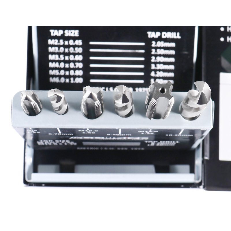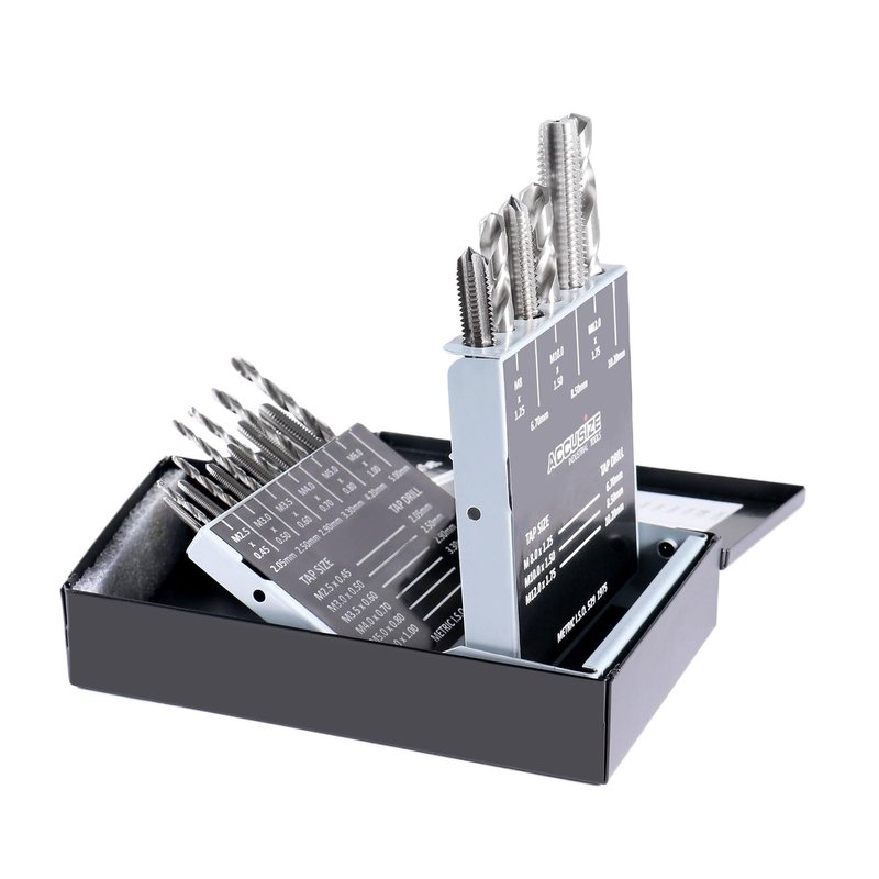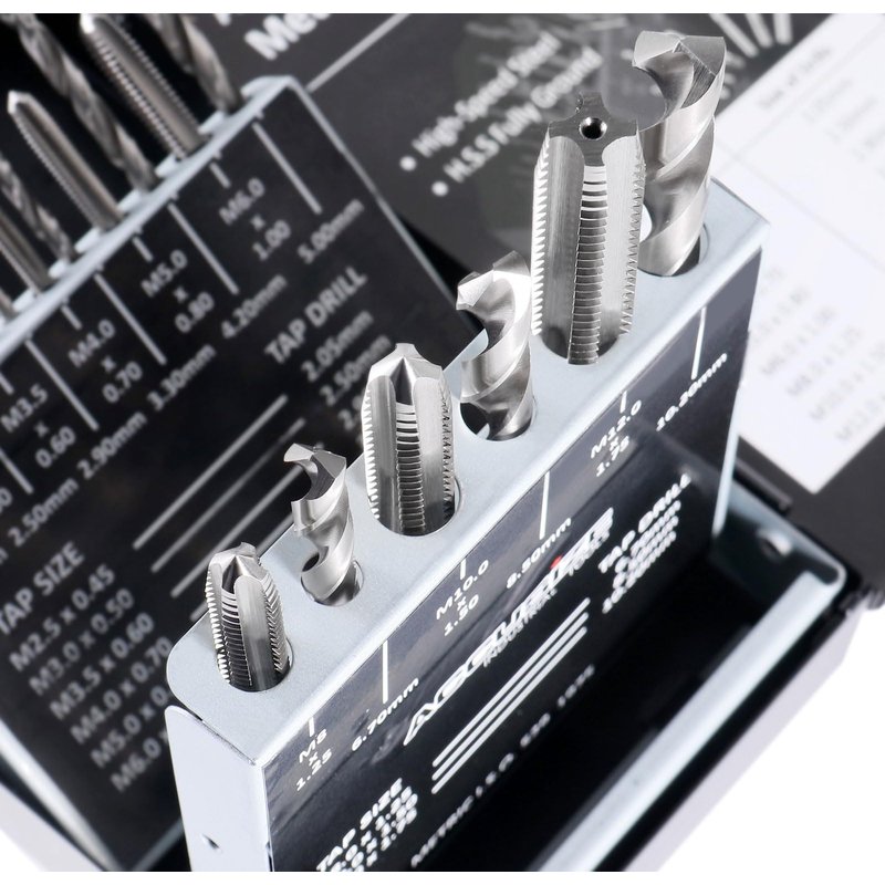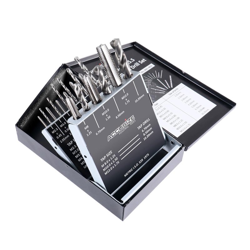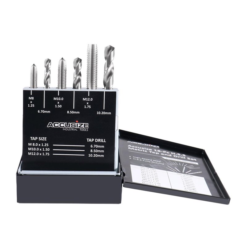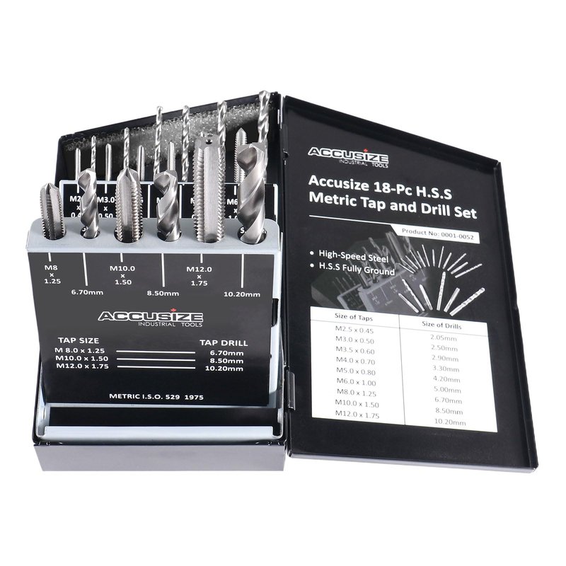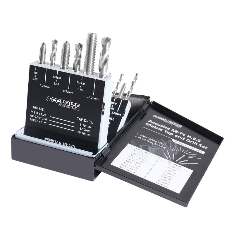 18Pcs Metric Tap&Drill Set Contains: 2.5 X .45 mm Tap, 2.05 Drill; 4.00 X .50 mm Tap, 2.50 mm Drill 3.5 X.60 mm Tap, 2.90 mm Drill; 4.0 X .70 mm Tap, 3.30 mm Drill 5.0 X.80 mm Tap, 4.20 mm Drill; 6.0 X 1.00 mm Tap, 5.00 mm Drill 8.0 X 1.25 mm Tap, 6.70 mm Drill; 10.0 X 1.50 mm Tap, 8.50 mm Drill 12.0 X 1.75 mm Tap, 10.20 mm Drill;