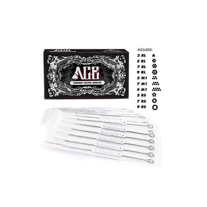 This 50-pack of pre-made, pre-sterilized tattoo needles by ACE Needles are precision manufactured to exacting standards; they are truly superb and some of the finest available. Crafted from the highest-quality surgical stainless steel, they have standard-length loop bars to fit all machines and tubes. They are also individually blister packed and pre-sterilized with ethylene oxide gas (proven by the color changing dot that is blue in the presence of EO gas). All packages are marked with lot #, size, sterilization and expiry dates (expiration dates are normally 2-3 years out from date of purchase as stock is refreshed monthly). Manufactured to CE, ISO-9002 & EN specifications. Bar length: 4.75". Needle tip length: 1.2". Bar diameter: 0.061". Includes: 50 needles with the following sizes: 3RL,5RL,7RL,9RL,5RS,7RS,9RS,5M1,7M1,9M1 5pcs each. (Pictures shown are actual photographs of our needles, but may be of a different size than what you are purchasing.)