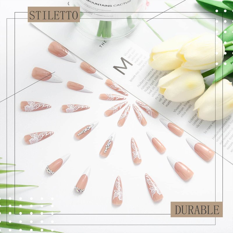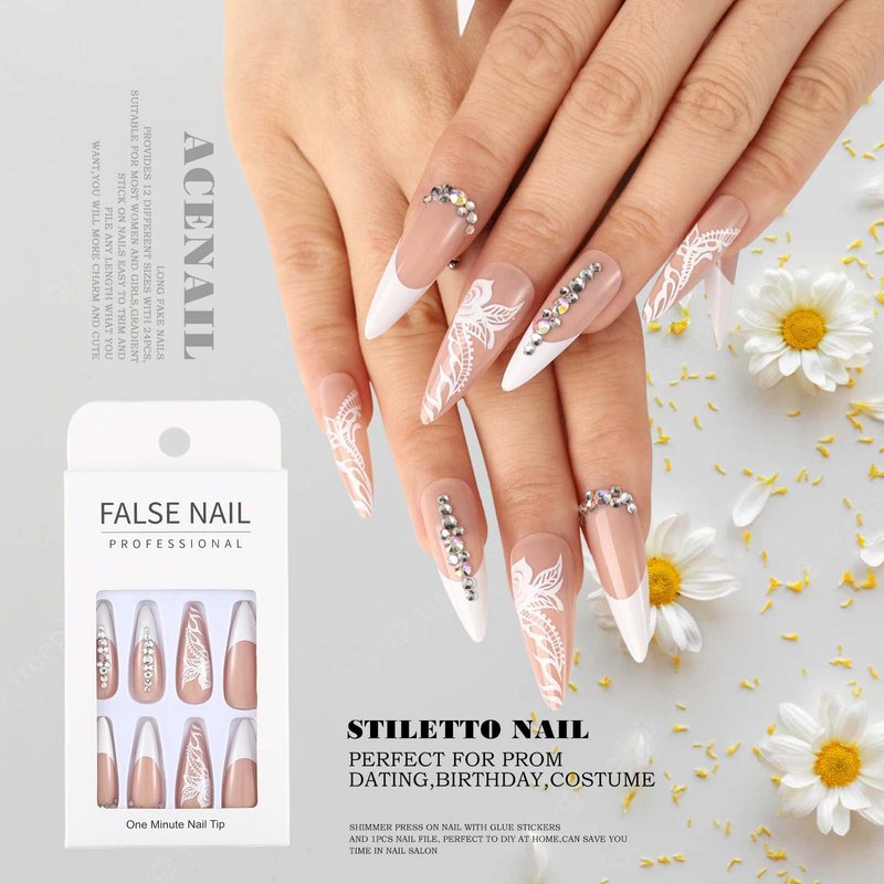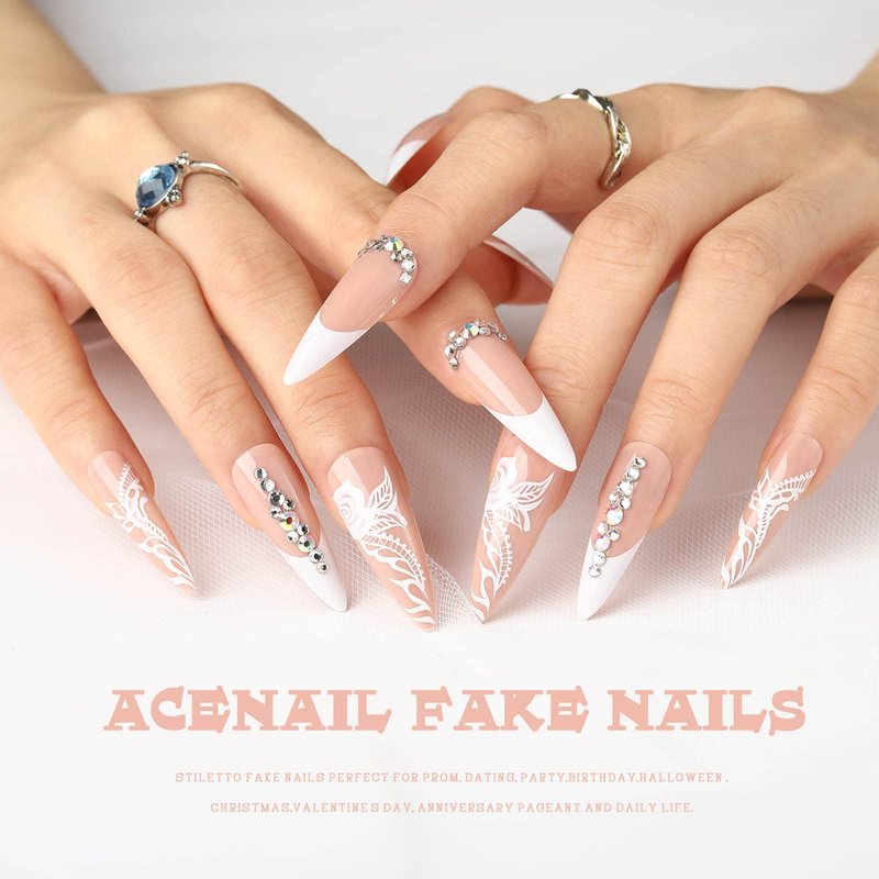 Acenail Stiletto Press on Nails Long Fake Nails Rhinestone False Nails with Designs Flower Acrylic Nails French Tips Press on Nail Glitter 3D Full Cover Artificial False Nail Glossy Nude Extra Long