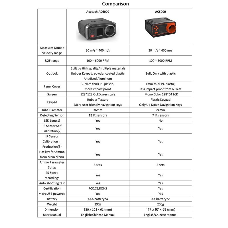 Support Micro-USB (5V/0.5A) power input (no battery charge function) or Use AA Alkaline battery*2 Measures Muzzle Velocity from 30 m/s ~ 400 m/s (90 ft/s ~ 1200 ft/s) Ammo parameter setting supports 5 memory slots Ammo parameter setting from Weight: 0.01g ~ 9.99g Caliber 4.5mm ~ 18mm 25 memory slots for velocity and ROF (Rate of fire) Tripod Ready mounting hole (Screw for standard camera / camcorder tripods ) Support Micro-USB(5V/0.5A) power input(no battery charge function) ROF range: 100~5000RPM Extra large caliber (diameter 24mm) Weight: 200g without battery Size : L x W x H = 117 x 97 x 59 (mm)