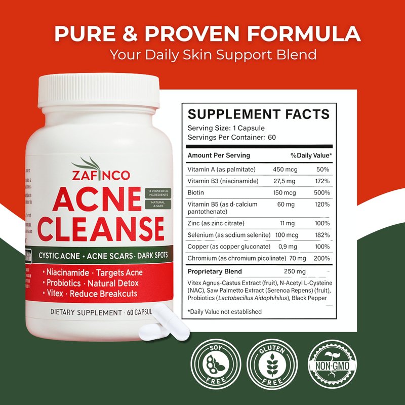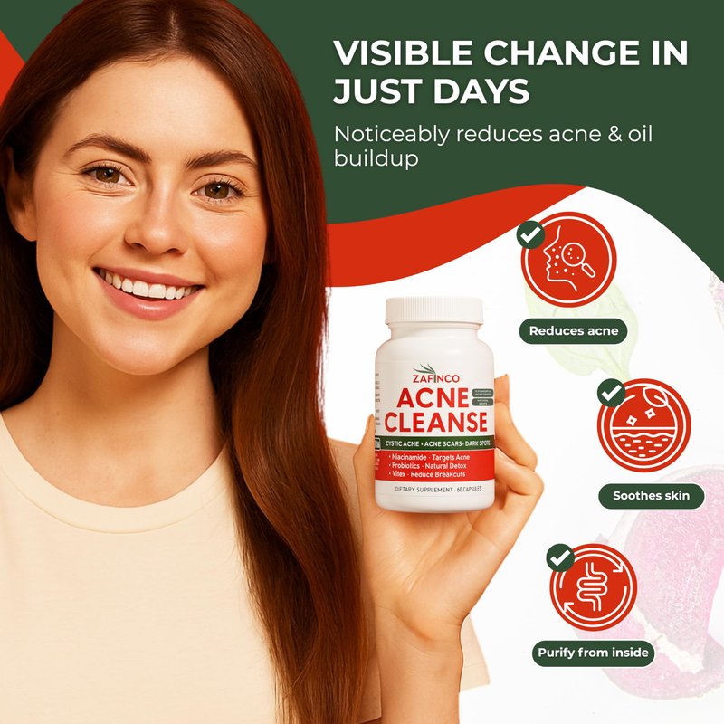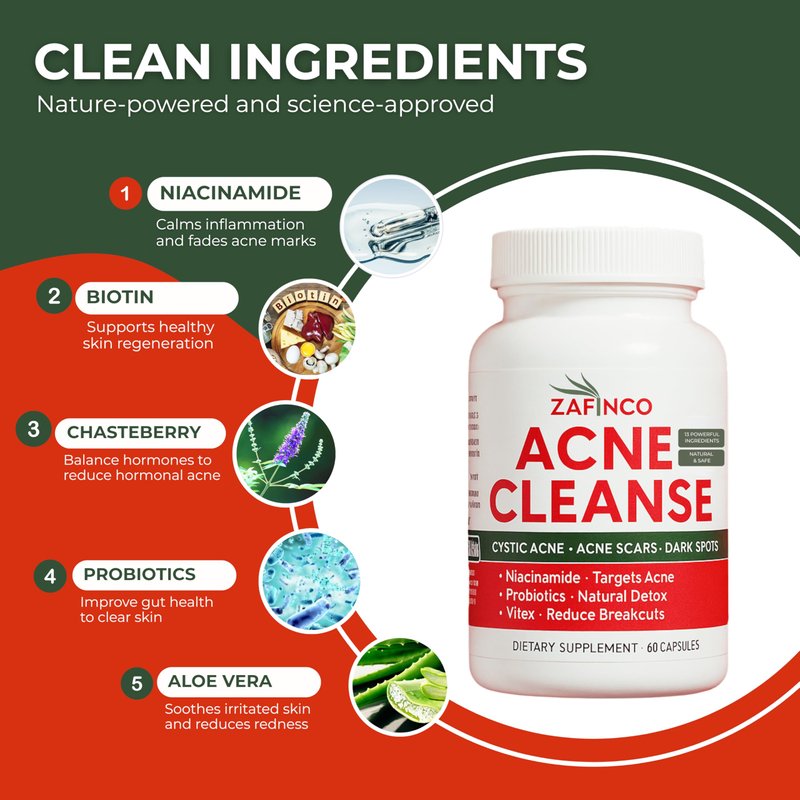 Acne Cleanse Capsules.Powerful Vitex Angus Extract, Niacinamide, Biotin for Teens & Adults. Organic Acne Treatment,Cystic Pimples, Oily Skin to Natural Clear Skin Vitamins Supplement- 60 Count
