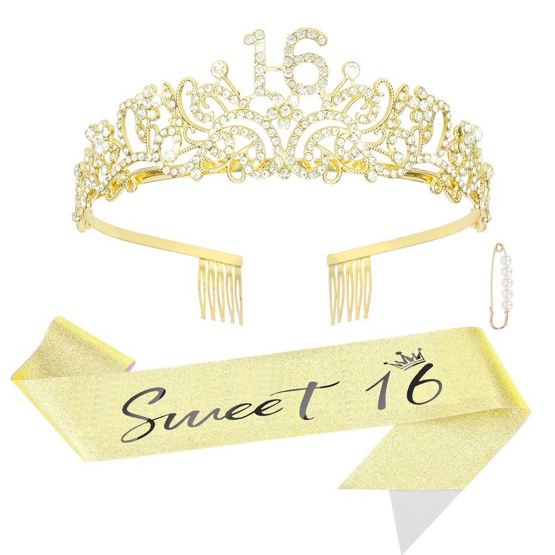 ACO-UINT 16th Birthday Crown and Sash Set, Sweet 16 Party Decorations 16th Birthday Decorations for Girls, Birthday Girl Crown Sweet 16 Gifts for Girls