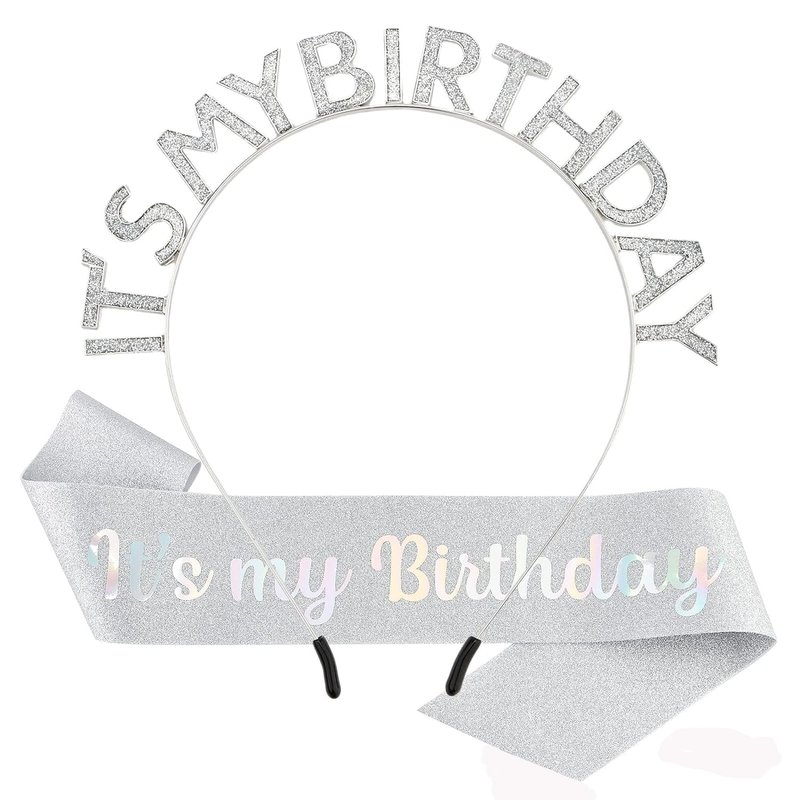 ACO-UINT Silver Birthday Crown for Girls, Cute Birthday Sash & Birthday Tiara for Women Set, Sweet Birthday Headband Birthday Decorations Birthday Gifts for Women