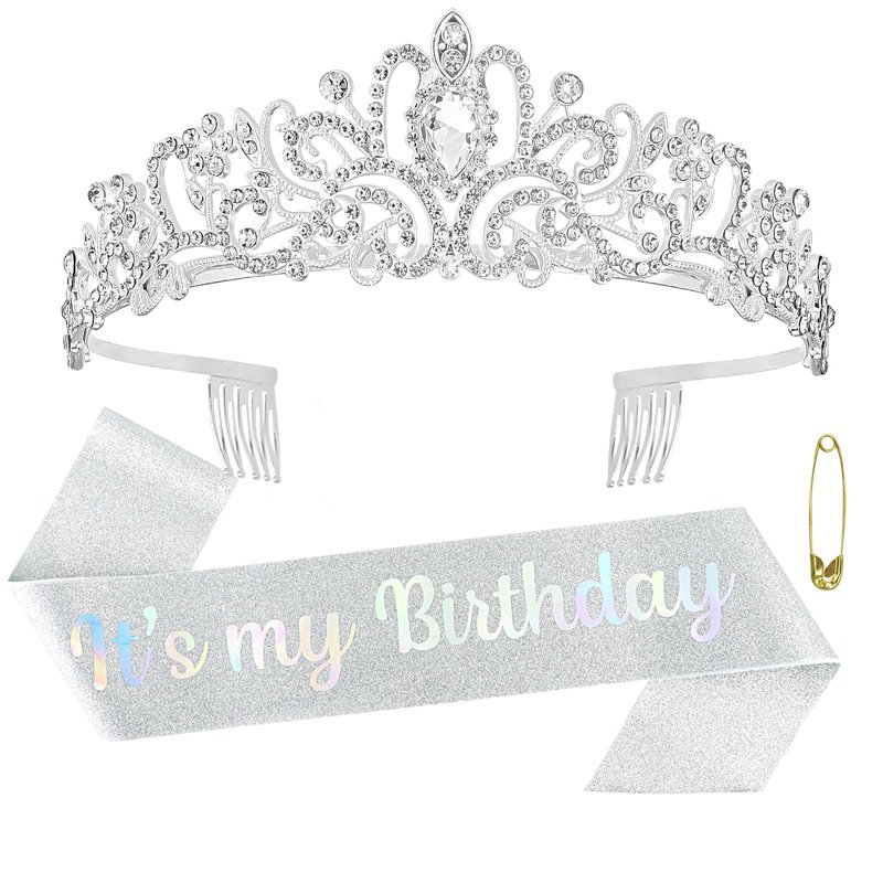 ACO-UINT Silver Birthday Crown for Women, Birthday Headband Birthday Sash Birthday Tiara, Birthday Girl Crown Birthday Queen Tiara Birthday Decorations Gifts