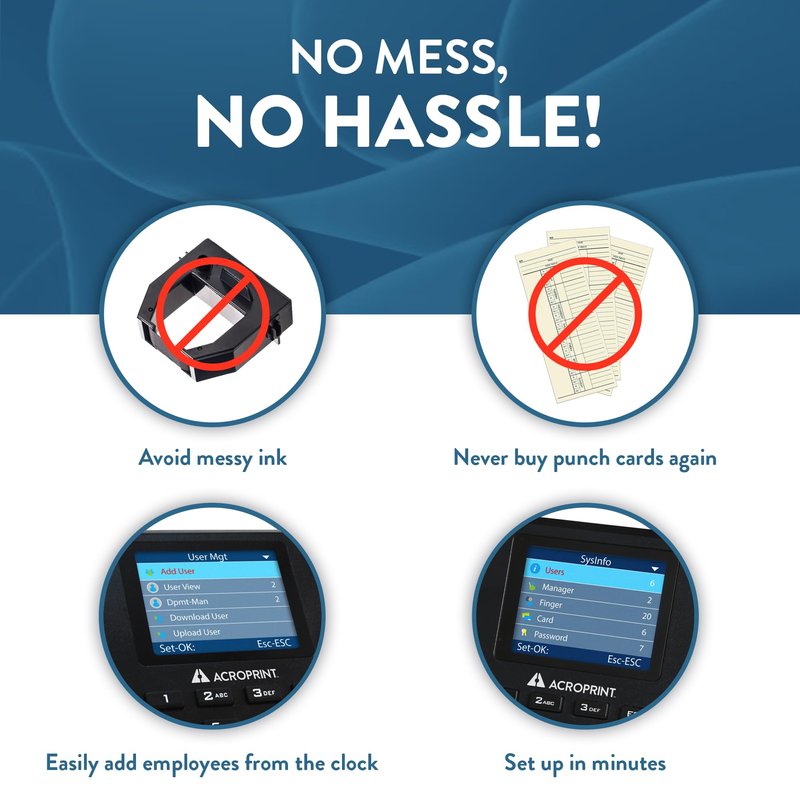 - No Mess, No Hassle: Never order messy ink or expensive paper punch cards again. Start using your new clock in minutes with no software installation, no network or PC connection needed, and easy employee setup right on the clock.
