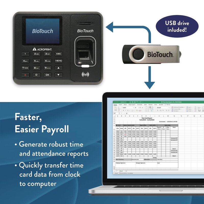 - Faster, Easier Payroll: Make payroll a breeze with robust time and attendance reports and simple, quick time card data transfers from the clock to your computer. USB drive included.