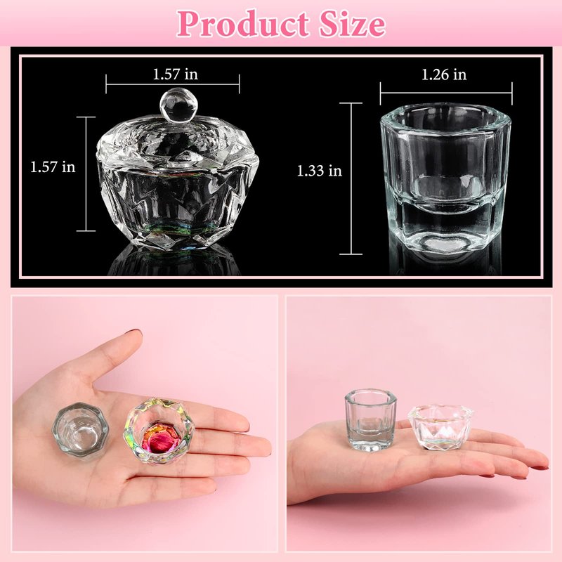 - Crystal Dappen Dish: Our nail art dappen dish come with 2 kinds of nail glass crystal cup,small but enough weight. Practical for mixing all acrylic liquid and powder for applying acrylic nails. Dappen Cup are great for putting alcohol in the small nail art bowl with lids for gel polish clean up to remove gel from around your nail or acetone for regular polish.