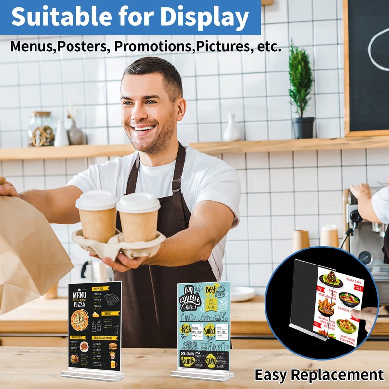 - đ¸ăDouble-sided DisplayăCompared to the backward-tilted stand, the transparent menu holder adopts a vertical double-sided design, and both sides can display and protect pictures or posters, menus, etc., and are clearly visible.