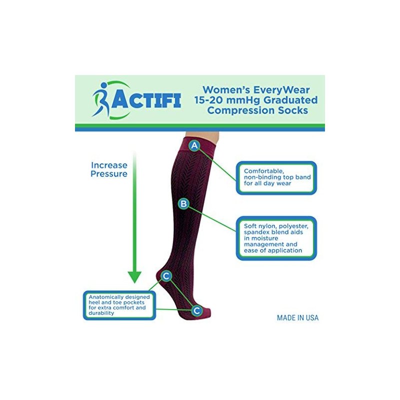 Recommended for mild varicose veins, post surgery, poor blood circulation, leg discomfort, mild to moderate swelling, tired and aching legs. Helps prevent deep vein thrombosis (DVT) for long distance travelers and edema. ALL DAY COMFORT – The supportive knitting pattern features a reciprocated toe and heel for extra comfort and durability, while the non-binding top band provides superior stay-up ability for all day wear comfort. Wear EveryWear – These fashionably patterned graduated medical compression socks allow you to look your best whether you are at the workplace, traveling, or simply dressing to impress. MADE IN USA – Proudly made in the USA to ensure the highest quality and value. The Latex-Free soft and breathable construction of 71% Nylon, 20% Polyester and 9% Spandex