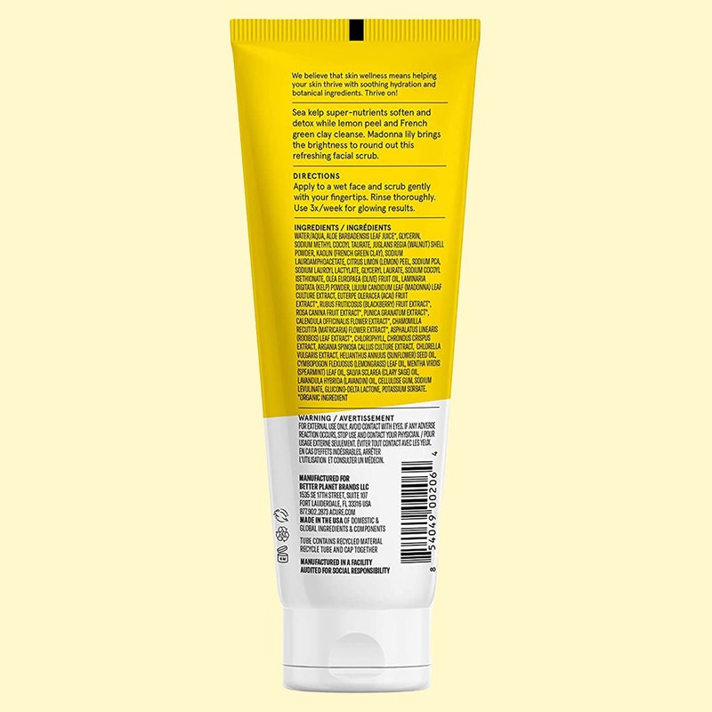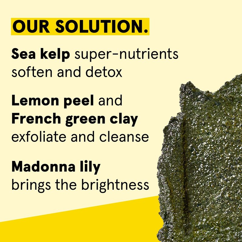 - OUR SOLUTION: Sea kelp super-nutrients soften and detox while lemon peel and French green clay exfoliate & cleanse. Madonna lily brings the brightness to round out this refreshing facial scrub