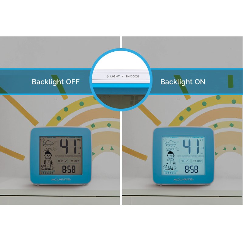 - Weather Alarm Clock - The display provides the date and time, features a 10-minute snooze function with momentary backlight, and automatically updates for daylight saving time