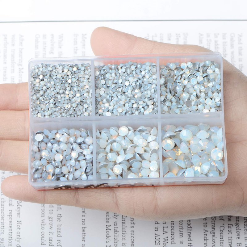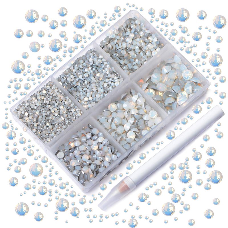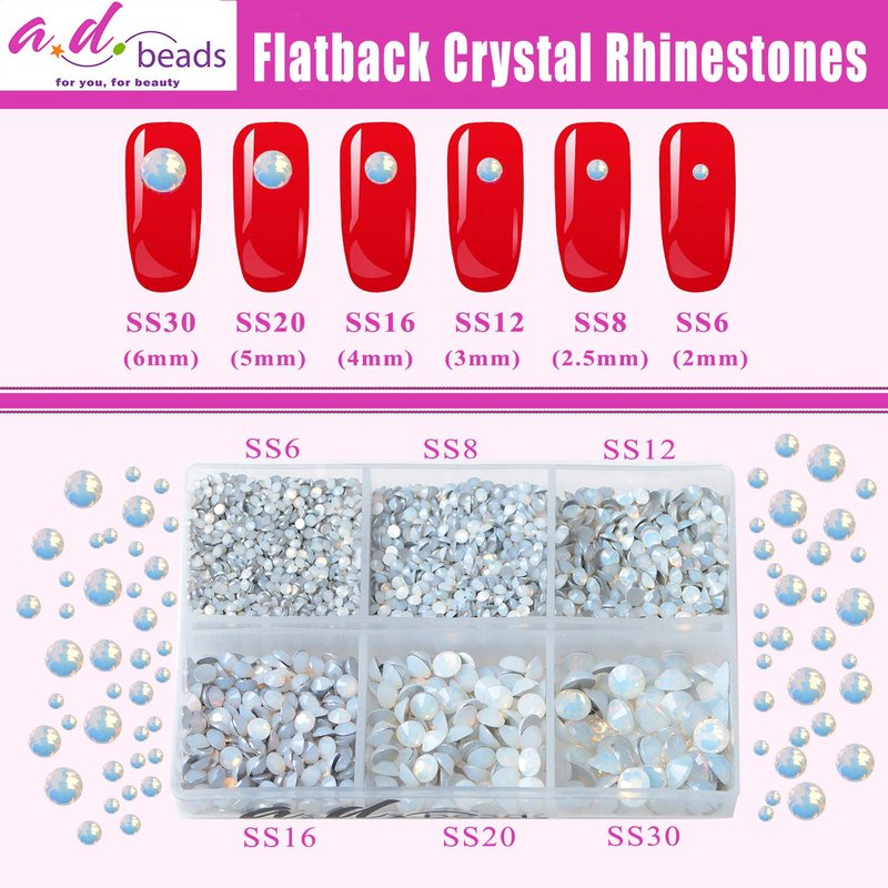 AD Beads 4300 Pieces Flat Back Nail Art Rhinestones Round Beads 6 Sizes (2-6.5mm) with Storage Organizer Box,Rhinestones Picking Pen for Nail Art Phone Decorations Crafts DIY (Opal White)