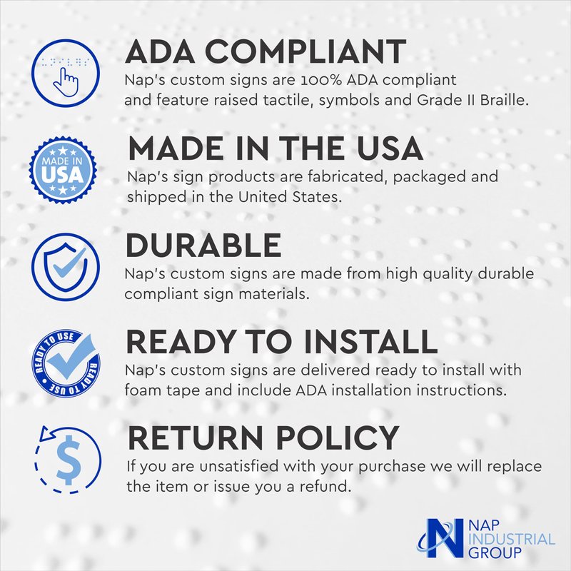 Full Color ADA Compliant Exit signs are available in several variations. Each sign features designs on a blue background with raised printing Braille white text. Each sign comes with two adhesive tabs to easily apply the sign to any wall. Choose between 6" x 6" or 6" x 3."