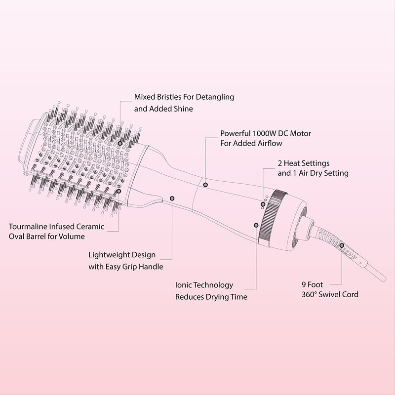 - NEGATIVE IONIC TECHNOLOGY: The hot air brush releases the negative ions, which moisture the hair, reducing the damage of the hair, nourishing the hair, eliminating frizz and enhancing shine for silky smooth hair, without static electricity.