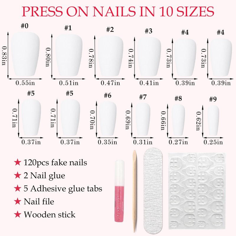 - Short press on nails kit: included 120pc/set solid colored matte coffin white press on nails for women girls teens kids DIY nails manicure. 2 sheets of adhesive glue sticky tabs, 2 nail glue, and 1 mini file come with everything you need for a quick DIY nail art manicure, you don’t need to purchase anything else. Save your money and time