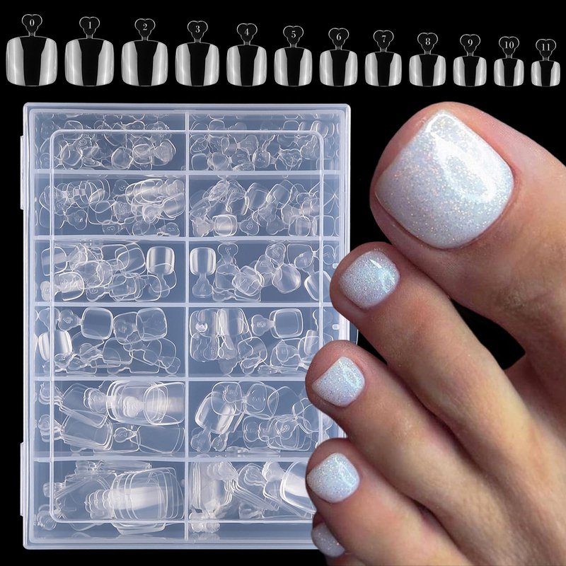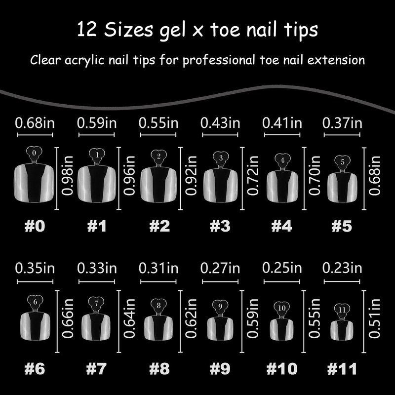 - High clear toe nail gel x tips, with perfect shape and short length, gel toe nail tips are short gel x toe nails, soft flexible full cover design. All clear nail tips are packaged in clear boxes, and number from 0-11, they are convenient to choose the most suitable size that fits your every finger, whatever you have large/medium/small nails hands, or wide/narrow/ flat toe nail beds