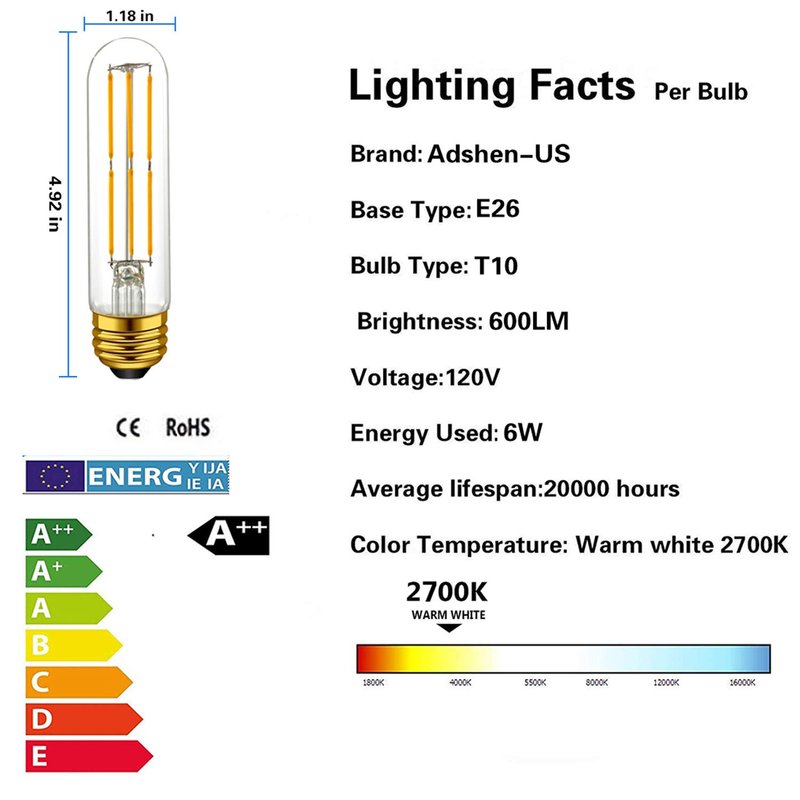 Adshen-US T10 LED Tubular Light Bulbs,Warm White 2700K,6W Dimmable Tube Vintage Led Filament Bulbs 60 Watt Equivalent,E26 Medium Base,LED Edison Bulb for Desk Lamp,Pendant Lights,4-Pack