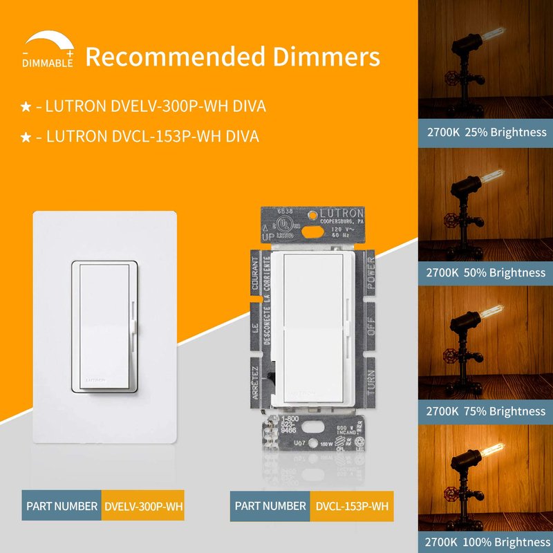 - 【DIMMER COMPATIBLE】:E26 tubular bulb is smooth dimming 0%-100%,no-flicker or strobe,no humming or buzzing.Not all dimmers are designed to work with dimmable LED light bulbs,To achieve ideal and smooth dimming effects, we recommend dimmers ( DVCL-153P or DVELV-300P).
