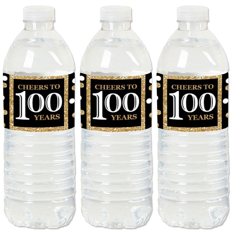 - MADE IN THE USA: Adult 100th Birthday - Gold - Birthday Party Water Bottle Sticker Labels are designed and manufactured at our Wisconsin facility using materials that are Made in America. Please Note: Beverages in image are not included. Water Bottle Labels No-Mess Glitter Print: Our beverage labels are designed with a printed image of glitter, eliminating glitter flake while maximizing bling effect!