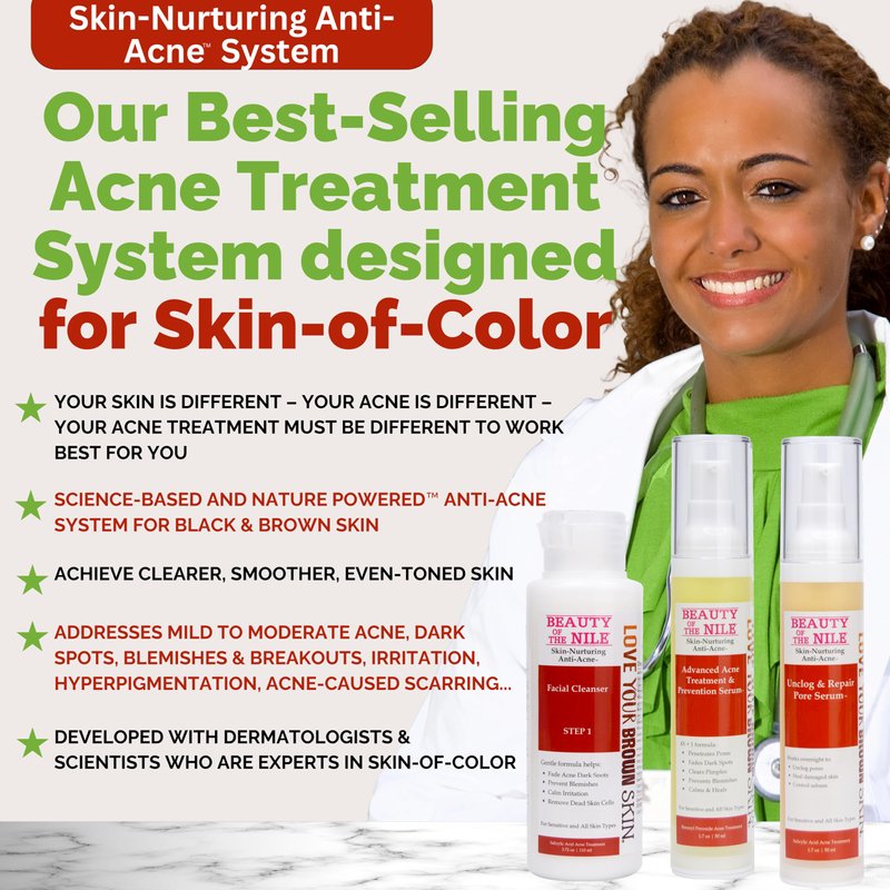 - YOUR SKIN IS DIFFERENT – YOUR ACNE IS DIFFERENT – YOUR ACNE PRODUCTS MUST BE DIFFERENT TO WORK BEST FOR YOU: Advanced Acne Treatment & Prevention Serum was specially developed with dermatologists and scientists to be effective on light brown to very dark skin. This gentle & effective formula addresses hyperpigmentation and irritation in skin-of-color, penetrates pores to fight impurities, reduces dark spots, clears pimples, helps prevent acne & blemishes, calms eruptions.