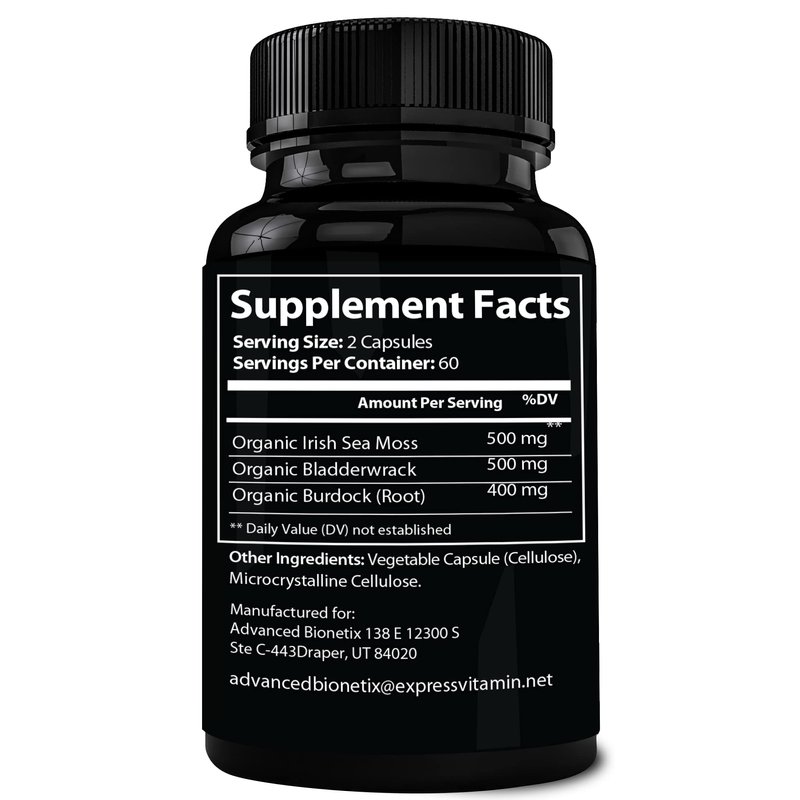 Advanced Bionetix Organic Irish Sea Moss Capsules, Raw Wildcrafted Seamoss Enhanced w/Bladderwrack & Burdock Root Capsules 120 Total Pills Antioxidant Packed. Prebiotic Superfood, Thyroid Support.