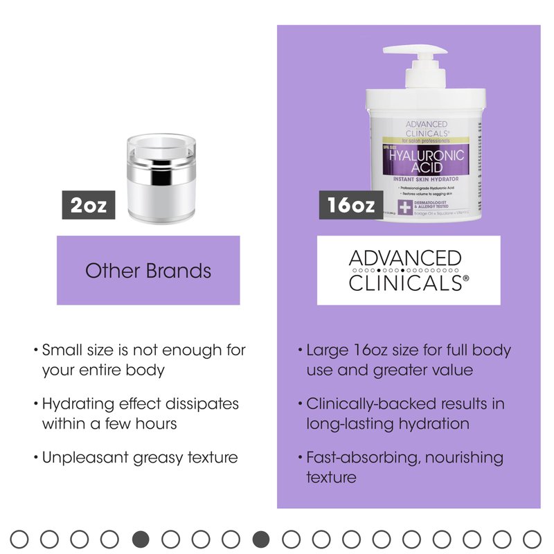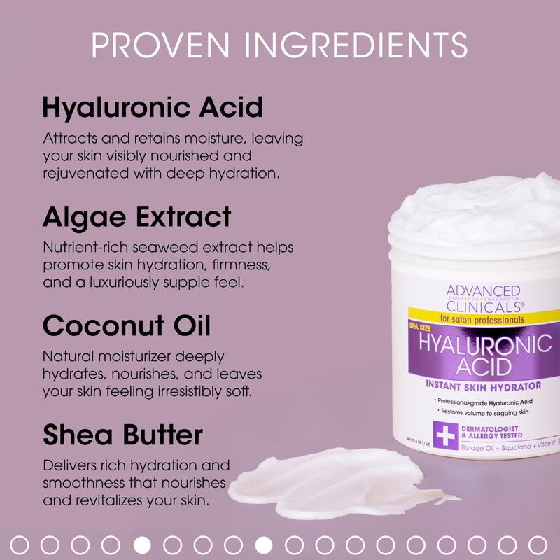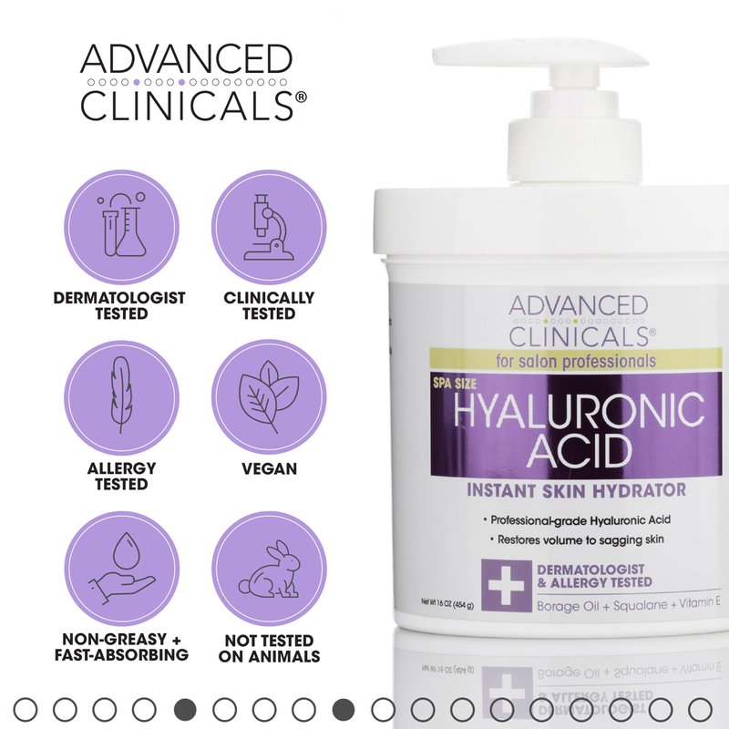 - DEEP SKIN MOISTURIZING - Hyaluronic Acid can help reduce the appearance of fine lines, sagging skin, & wrinkles by plumping + deeply moisturizing the skin, while also restoring elasticity. This Advanced Clinicals Hyaluronic Acid Cream helps hydrate & nourish the skin making it smoother for more youthful & healthy-looking skin. This lightly scented Hyaluronic Acid body lotion is highly effective against reducing the appearance of premature aging, wrinkles, dry skin, crepey skin, & more.