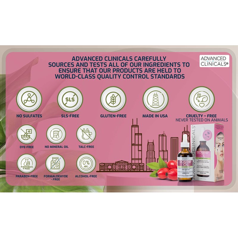 - MOISTURIZING AND EXTREME HYDRATION- Restore your skins youthful appearance with this top rated anti-aging face oil from Advanced Clinicals. Rosehip oil calms and hydrates any skin type (dry skin, oily skin, and sensitive skin) for a brighter complexion and improved elasticity.