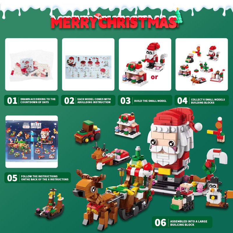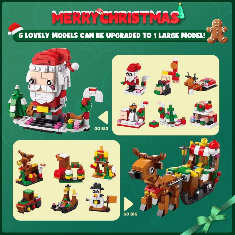 - 【The Joy of Christmas】It's the best Christmas gift that keeps on giving, spreading joy and fostering creativity.Kids get to start off each day building a new toy and then each 6 small Christmas models can be assembled into a large Santa Claus, Christmas Reindeer.Each package includes a instructions, kids can easy to follow & build the blocks toys.