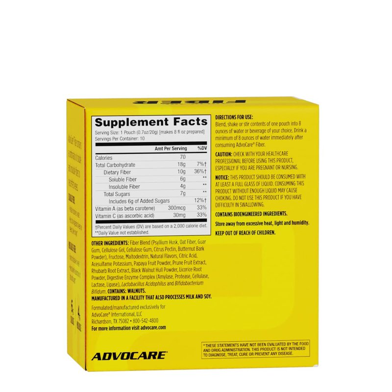 - About AdvoCare Fiber: Soluble fiber supplements aid in cleansing the digestive tract and support digestive health by helping to eliminate waste