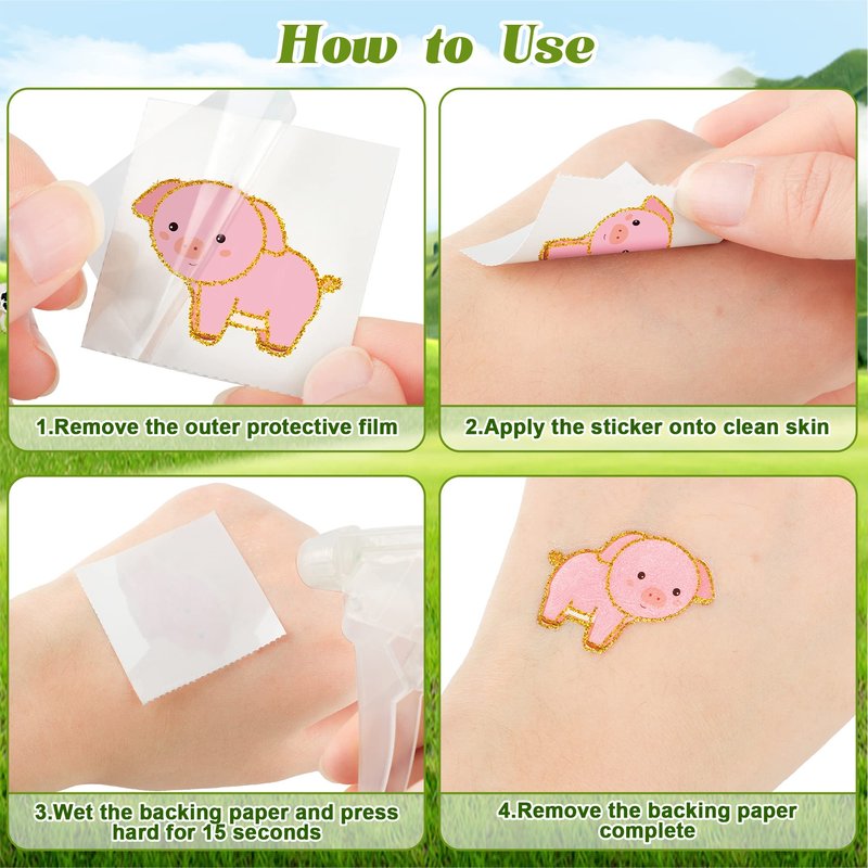 - User guide: adopting the cutting lines design, our farm barnyard tattoos are easy to use; you can peel off the protective film, put the tattoos on your skin, then wet and press the tattoos for 15 seconds; the tattoos can be removed using micellar water or makeup remover