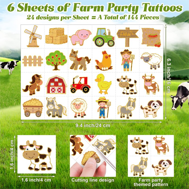 - Package contents: you will receive 6 sheets of farm party tattoos, totaling 144 pieces in 24 designs, sufficient to meet your use needs for farm animal theme party; and the size of each sheet is 9.4 x 6.3 inch/24 x 16 cm