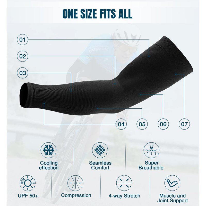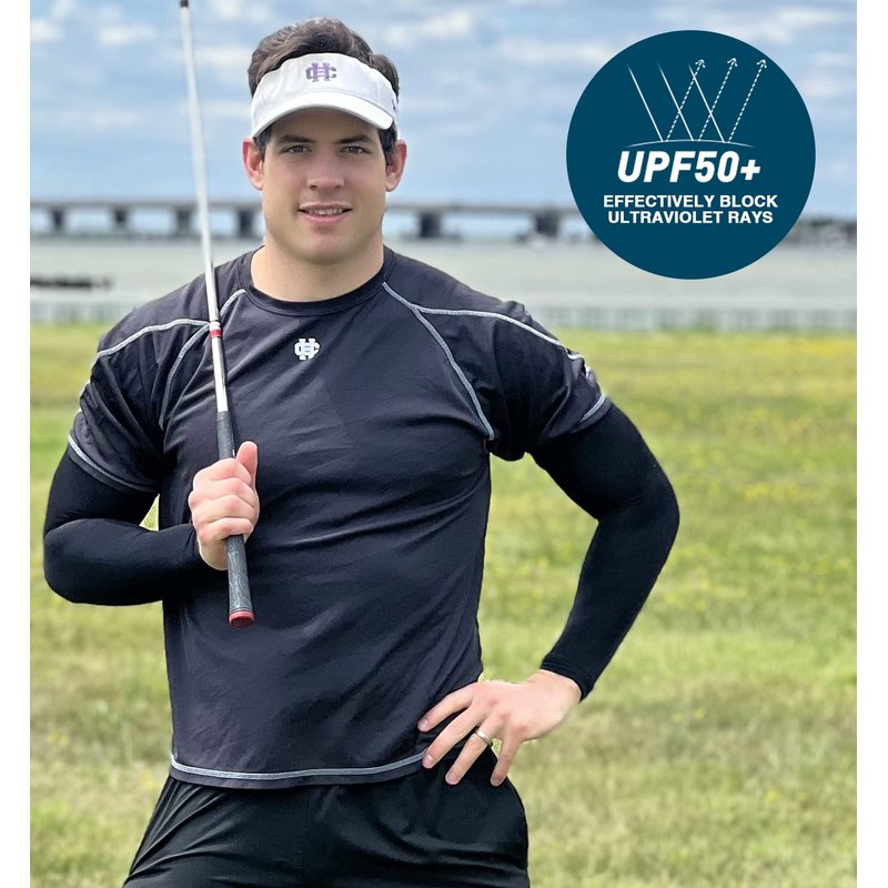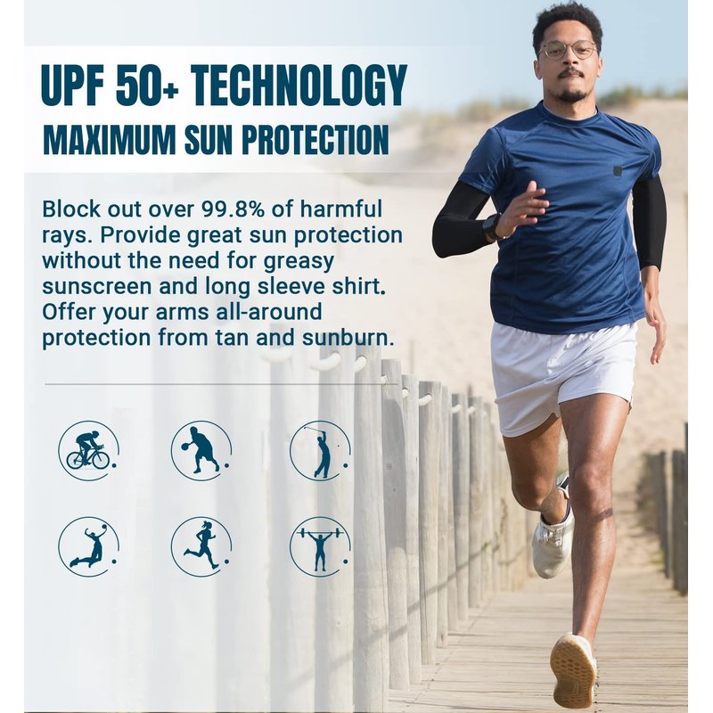 - All-Round Sun Protection - UPF 50+ protective technology works great to keep the harmful sun rays off your skin when golfing, shooting, running, bike riding, etc. No need for greasy sunscreen or long sleeves shirts. These uv sun protection arm sleeves shield your arms from sunburn and skin damage during long days in sun.