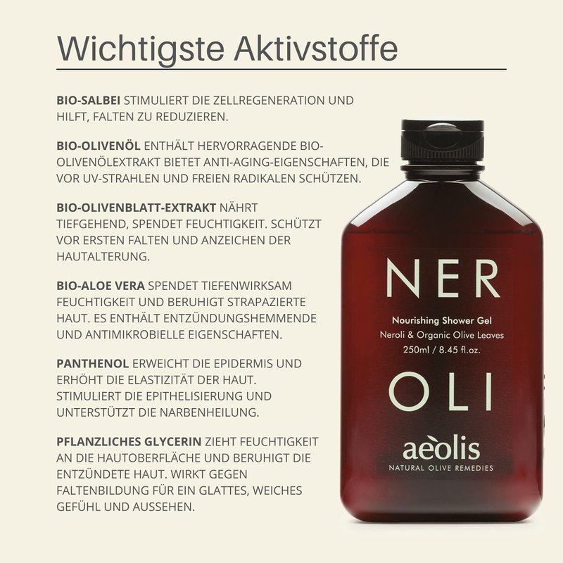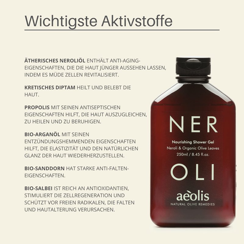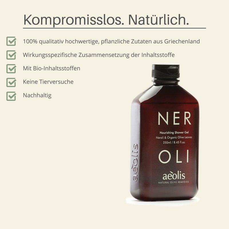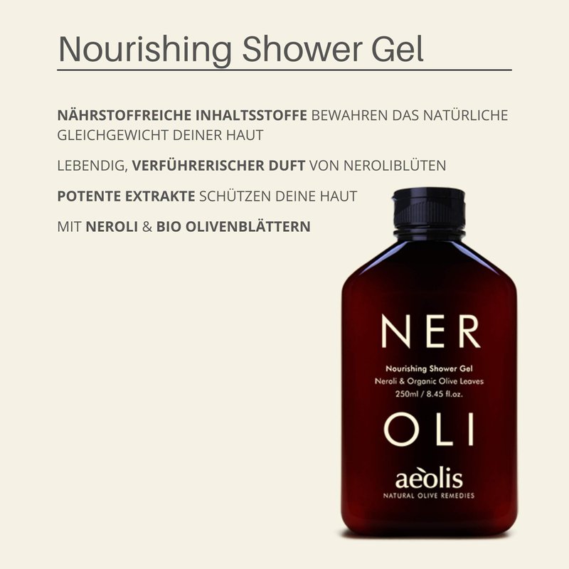 - Aeolis Nourishing Natural Shower Gel features rich extracts of neroli, olive leaves and other natural ingredients. Aeolis does not use alcohol, animal byproducts or harmful chemicals in this body scrub. Everything is natural and GMO free, and leaves your skin feeling clean and refreshed.