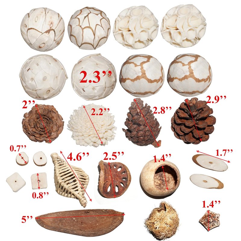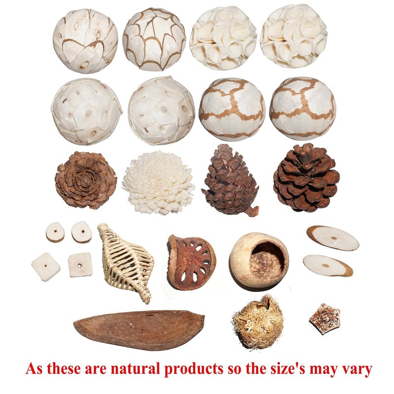 - Package Includes:- 2 CANNAGE SOLA WOOD, 2 CRAPE BALL SOLA WOOD, 2 CHIPS BALL SOLA WOOD, 2 TIP SOLA WOOD, 2 DANA CHIPS SOLA WOOD, 2 SOLA CHIPS SOLA WOOD, 2 PAISA CHIPS SOLA WOOD, 2 PINE CONES, 1 LOOFA CUT, 1 BELL FRUIT/Wood Apple CUT, 1 CEDER ROSE, 1 MAHOGANY SHELL, 1 MAHOGANY SLICE, 1 BELL FRUIT CUP, 1 ZINNIA SOLA WOOD, 1 RATTAN PRODIP