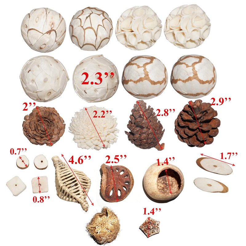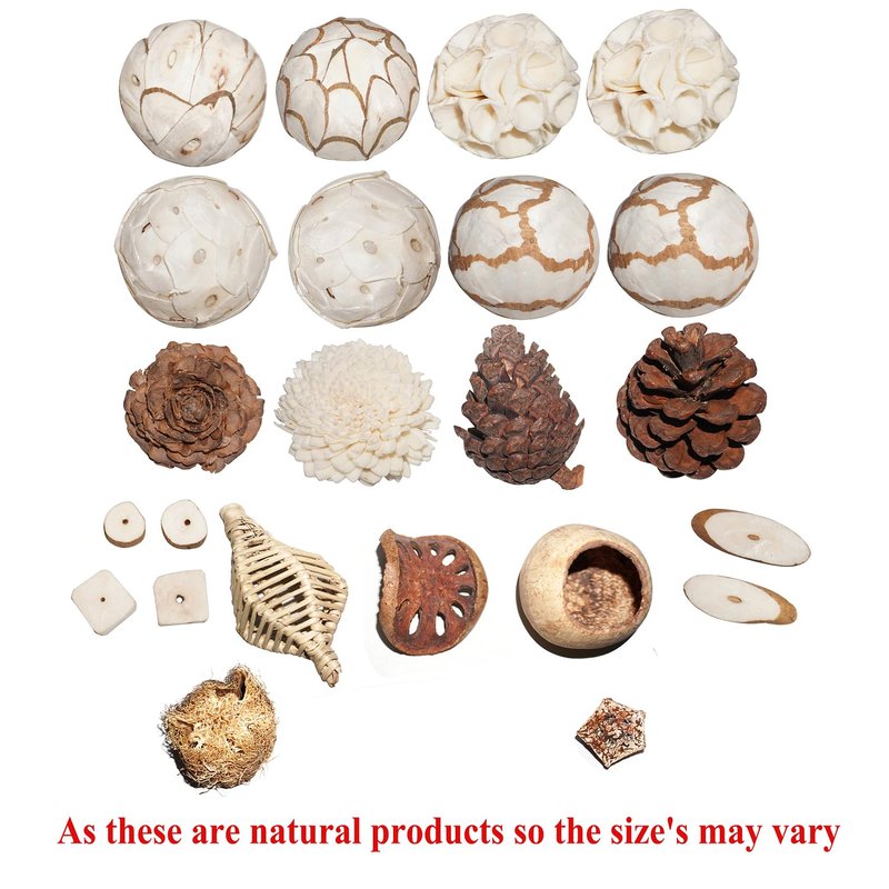- Package Includes:- 2 CANNAGE SOLA WOOD, 2 CRAPE BALL SOLA WOOD, 2 CHIPS BALL SOLA WOOD, 2 TIP SOLA WOOD, 2 DANA CHIPS SOLA WOOD, 2 SOLA CHIPS SOLA WOOD, 2 PAISA CHIPS SOLA WOOD, 2 PINE CONES, 1 LOOFA CUT, 1 BELL FRUIT/Wood Apple CUT, 1 CEDER ROSE, 1 MAHOGANY SLICE, 1 BELL FRUIT CUP, 1 ZINNIA SOLA WOOD, 1 RATTAN PRODIP,