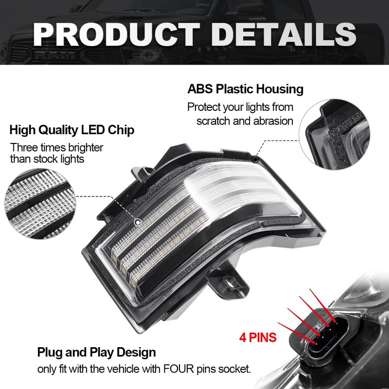 - 【Three Modes Two Colors】Super bright light output, white light for parking lights and daytime running lights, amber light for dynamic sequence flashing turn signals. (Note: Aexploer's light connector socket is the same 4-pin version as the original, with built-in daytime running light & parking light & turn signal function. If your truck rearview mirror does not have built-in parking and daytime running light , That means your light socket is 3-pin, so it doesn't fit your truck)