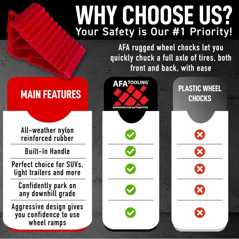 "Have you tried cheap plastic chocks that slip, crack or require pounding? AFA Chock Blocks have an aggressive ribbed design that grips your tires fast to give you the confidence to park on any downhill grade - or to use with wheel ramps on slick garage floors without fear of crushing. Just kick ‘em in place and walk away… that’s it. Here’s what you get: - 2 Wheel Chocks enough for f 1 axel. - Nylon reinforced rubber that’s 2-times stronger than old rubber designs that rip and tear. - Chock Blocks that won't crack, chip, slip and slide like cheap plastic options. - Wheel chocks that stand up to sun, sand, snow, mud, dirt, dust, and ice. - A textured bottom and ribbed top that grips your tires without the need to hammer or pound them into place. As you check out the pictures you'll notice the compact design. At 9 x 6inches, with a 6-inch height, your Chock Blocks are small enough to toss behind the seat, yet tall enough to stop any sized tire from rollback (even truck tires). Also, notice the beefy handles. Unlike cheap options with eyebolts (that rust and bend), this large handle is made for easy grabbing, with extra room to tie your Chock Blocks together using rope for quick pullouts. Your order ships with a pair of dual wheel chocks that are perfect to keep your RV, Camper or Trailer in place while your away. But don’t take our word for it... Toss a pair of Chock Blocks under your car, truck, trailer, ATV, or RV tires, and join customers who say Chock Blocks give them the confidence to park on any incline, and in any weather with complete peace of mind that their wheels will stay put. Our wheel chocks for travel trailers are the perfect camper blocks and wheel stopper that you are looking for! Also applicable as wheel chocks for boat trailers. These trailer chocks are the perfect camper wheel chock!"