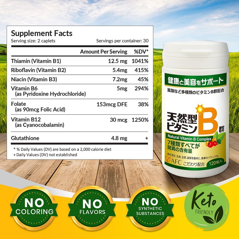 AFC Japan Natural Vitamin B Complex with B1, B2, B3, B6, B12, Folic Acid & Glutathione Yeast Extract, No Synthetics, Non-GMO, Supplement for Stress, Energy, Immune & Nervous System,120 Vegan Caplets