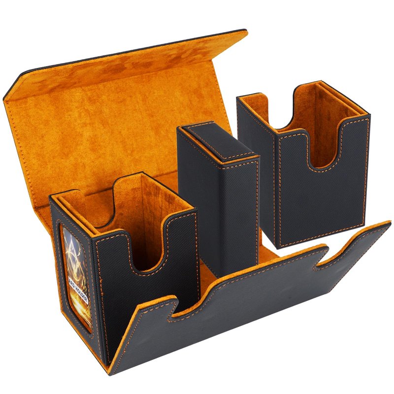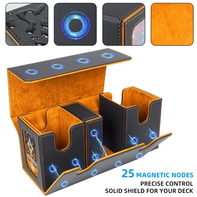 AFIING MTG Commander Card Storage Box - Fits 200 Double Sleeved Cards,3-in-1Card Deck Case,Strong Magnet Card Organizer For Magic Commander TCG CCG,4Dividers &2 Toploaders, Black/orange