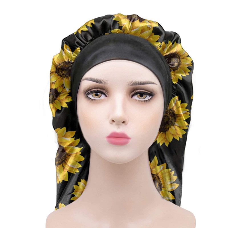 AFPANQZ Cute Sunflower Long Satin Bonnet Sleep Cap for Curly Braids Dreadlocks Long Hair Double Layers with Soft Elastic Band for Women Girls Silky Night Cap to Protect From Loss Black Yellow