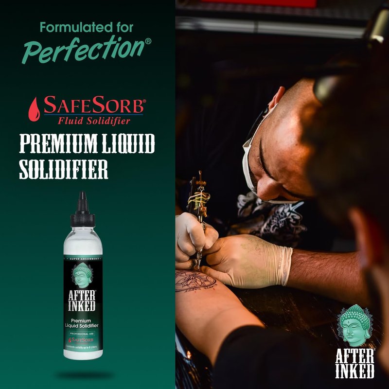 - QUICK SOLIDIFIER: Keep your workspace clean and safe with our liquid solidifier's unique formula that absorbs fluids in seconds. After Inked liquid solidifier's moisture-absorbing properties allow your space to have a quick cleanup to be able to return to your tattoo session quickly and efficiently, ready for the next client. A must-have for any professional tattoo artist or apprentice.