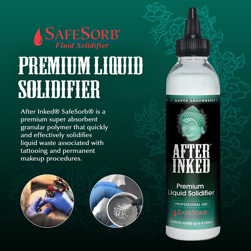 - SUPER ABSORBENT: After Inked liquid solidifier is a super absorbent granular polymer powder that quickly solidifies liquid waste associated with after tattoo and permanent makeup procedures. This tattoo solidifier is formulated to firm liquids from tattoo ink and pigment cleaning. It can be used to safely dispose of liquids on the spot or poured into rinse cups for disposal off-site if needed -- wherever you need it.